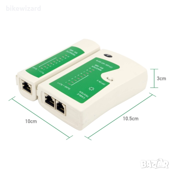 Открийте дефектни RJ45, RJ11 и BNC кабели с този тестер за мрежови кабели. Свържете единия край на кабела към основното устройство, другия към отделящото се дистанционно устройство и включете захранването. Вече положени кабели също могат лесно да бъдат проверени. Можете да използвате тестовите светодиоди, за да видите как са свързани кабелите: за да идентифицирате къси съединения, неправилно окабеляване или кръстосани връзки. Мрежовият тестер има 2 скорости: 1) натиснете "ON", за да извършите тест на кабела с умерена скорост, 2) за ниска скорост: натиснете "S". Позиция "OFF" изключва устройството. Захранването от линейния тестер е чрез: 9V PP3 блокова батерия (не е включена в доставката); Цвят: сив / зелен; Тегло: 97 г; Размери: 10x10,5x3 см; материал: пластмаса