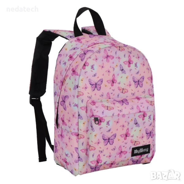 Ученическа раница за детска градина за момичета, в дъгово розово с цветен дизайн на пеперуди. Разполага с 1 голямо отделение и външен джоб с цип, регулируеми презрамки, мек гръб и дръжка за носене