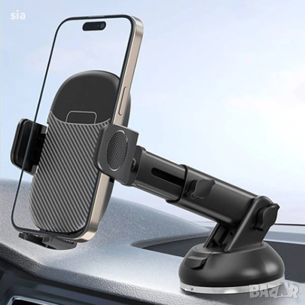 Удобна и здрава универсална стойка за телефон с вендуза, подходяща за монтаж върху стъкло, табло или гладка повърхност. Осигурява стабилно захващане и комфорт при шофиране, като позволява лесно позициониране на смартфона за навигация, разговори или музика.