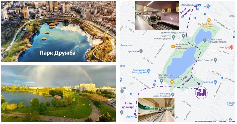 ЛОКАЦИЯТА е супер перспективна, намира се непосредствено до парк Дружба и Дружбенското езеро (Дружба 1), което само по-себе си е паркова зона, както и между 2 метро станции (Дружба и Искър). В непосредствена близост пък има спирка и на автобуси, детски градини и училища (държавни и частни).