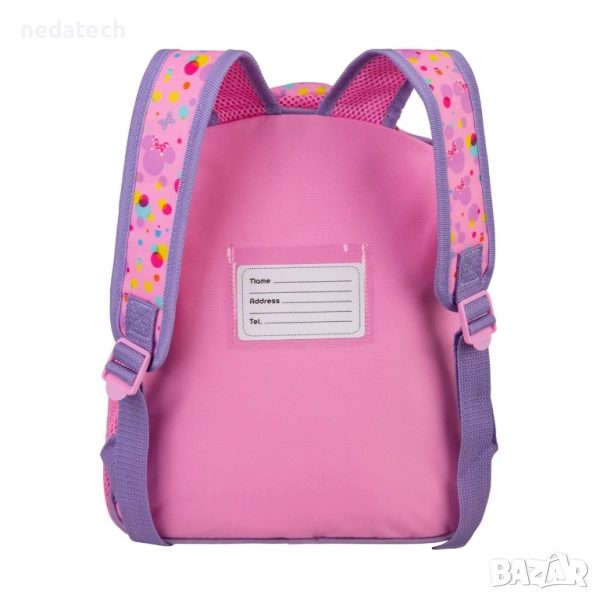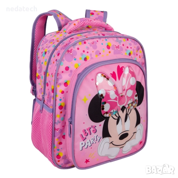 Ученичка раница за момичета, в розово, 2 отделения, с 1 голям джоб, 2 мрежести джоба отстрани за бутилка с вода и 3D дизайн на Мини. Има езиче на гърба за детайлите на детето, здрави ципове и регулируеми презрамки.
