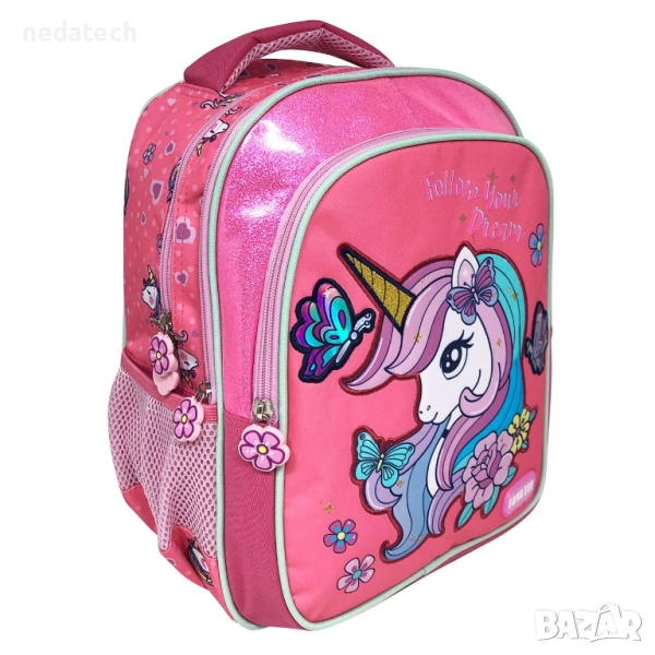 Ученическа раница за момичета, в розово, 2 отделения, с 2 мрежести джоба отстрани за бутилка с вода и дизайн с еднорог със златен рог с брокат и холографски пеперуди. Има мек гръб, издръжливи ципове и регулируеми презрамки.
