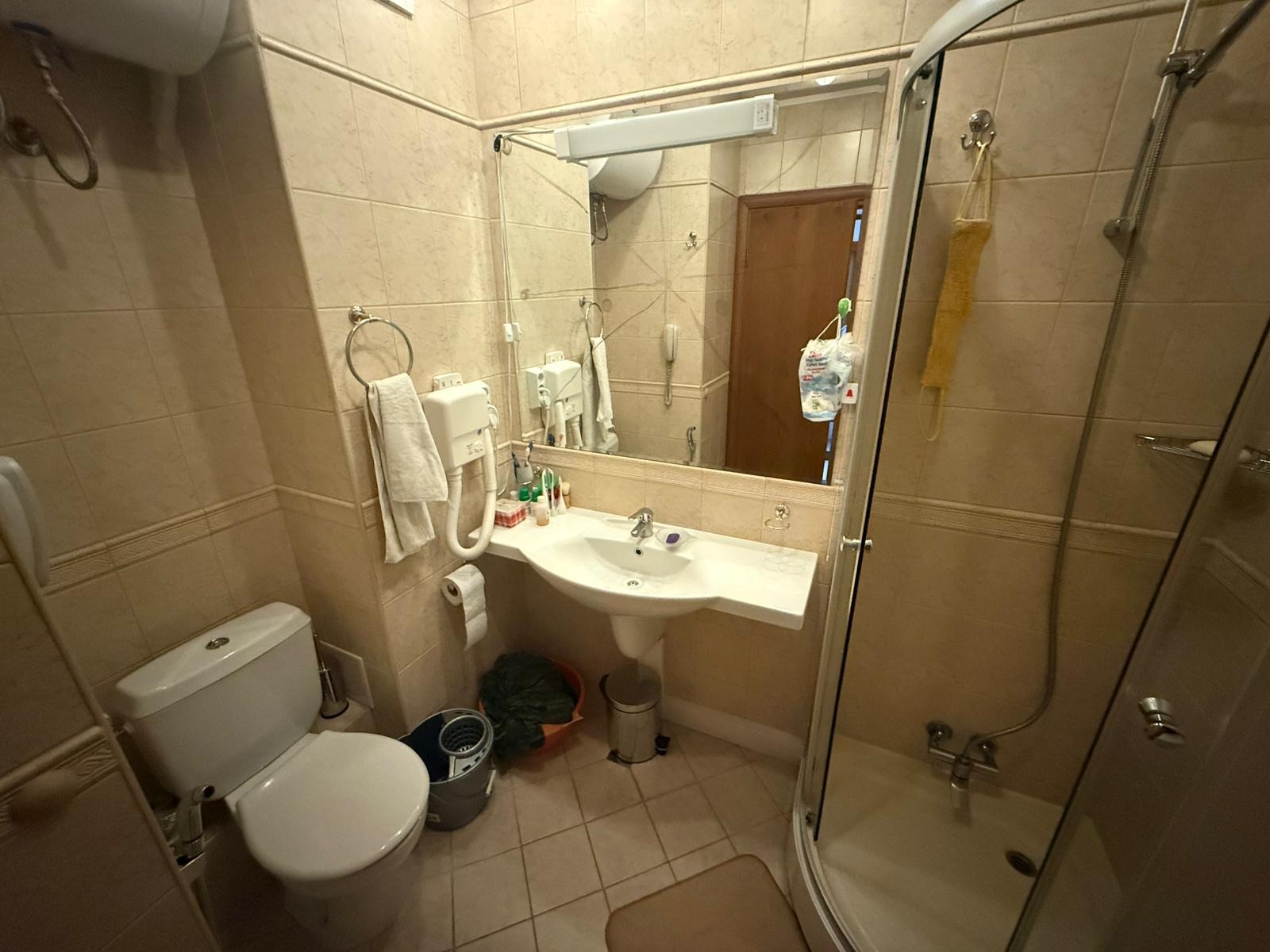 На Вашето внимание, предлага се двустаен апартамент в хотела, разположен на 5-ти етаж.Състои се от вх.антре, дневна с кухня и трапезария, спалня, баня с тоалетна и прекрасен балкон с панорамна гледка към града и планината.