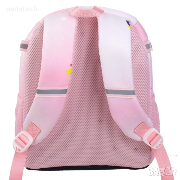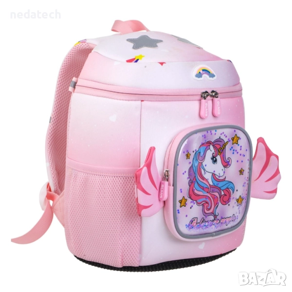 Раница за детска градина, розова с дизайн на еднорог и сребърни конфети. Разполага с 1 голямо отделение и голяма торбичка, преден джоб с цип, 2 странични джоба с розова мрежа и розова дръжка.