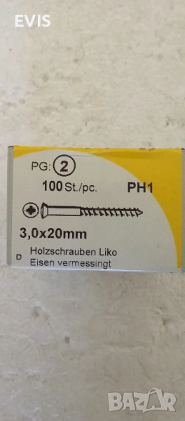 Винтове за дърво с месингово покритие 3х20mm, PZ, 100бр. – внос от Германия ✅ Размер: 3x20mm ✅ Вид глава: PZ ✅ Резба: непълна ✅ Покритие: месингово ✅ Количество в кутия: 100 бр. ✅ Висококачествен немски внос Подходящи за дървообработване, мебели, ремонтни дейности и хоби проекти. 🚚 Изпращам с Еконт и Спиди 🎁 Безплатна доставка при поръчки над 49 лв. 🔗 Можете да комбинирате с други мои обяви за крепежи.