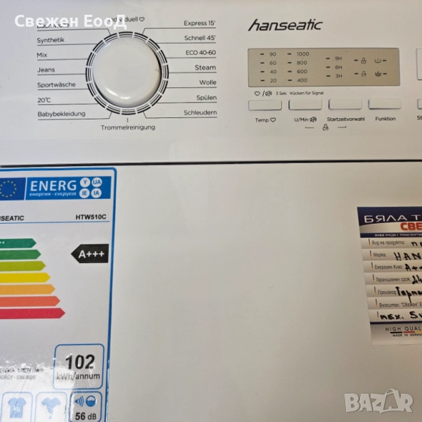 Благодарение на предварително зададеното време за стартиране, можете да промените времето за стартиране на програмата. Моделът разполага с избор на програма с един бутон. Можете също така да получите достъп до информация за скоростта на центрофугиране и температурата. Моделът Hanseatic HTW510C центрофугира с максимална скорост до 1000 оборота в минута, което е под средното ниво. Той постига оценка за ефективност на центрофугиране C.