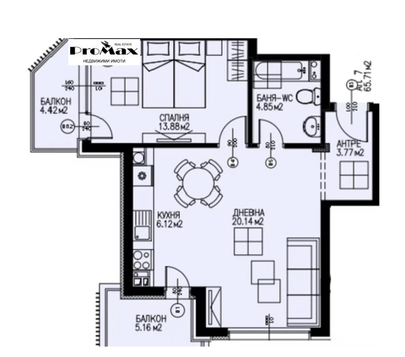 Апартаментът е с чиста площ 62 кв.м., с общи части 80 кв.м., и отлично разпределение: