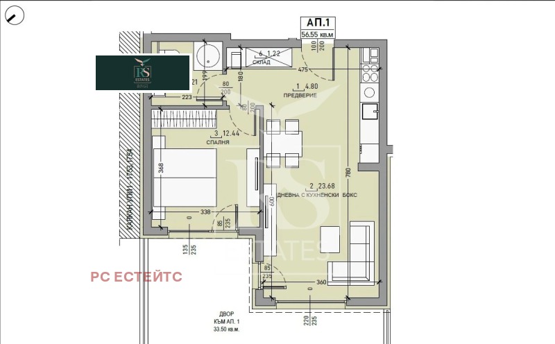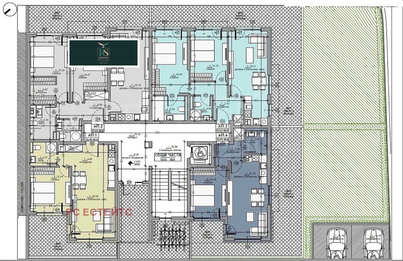РС ЕСТЕЙТС предлага за продажба:2-стаен напартер 62,19 кв.м.с общи части , чиста площ 52,95 кв.м. с двор към апартамента 122,44 кв.м.