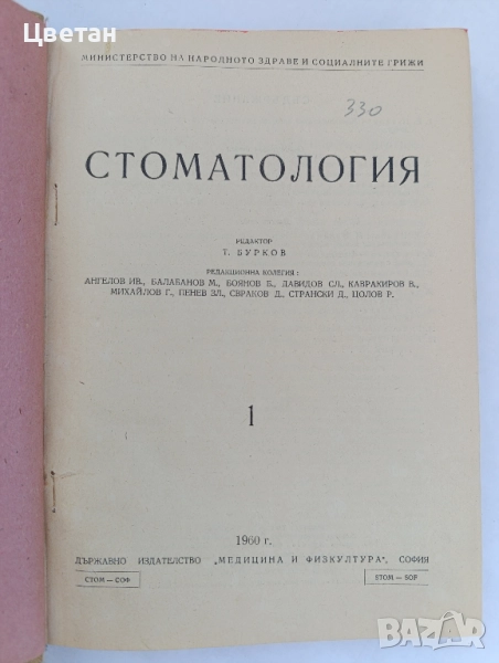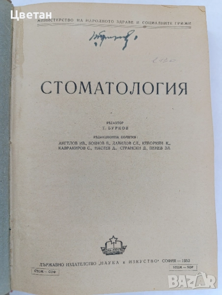 Стоматология Т. Бурков София 1953 – 45,00 лв, Съдържа терапевтични, хирургични и ортопедични статии. Разгледани са въпроси за практиката с много снимки.