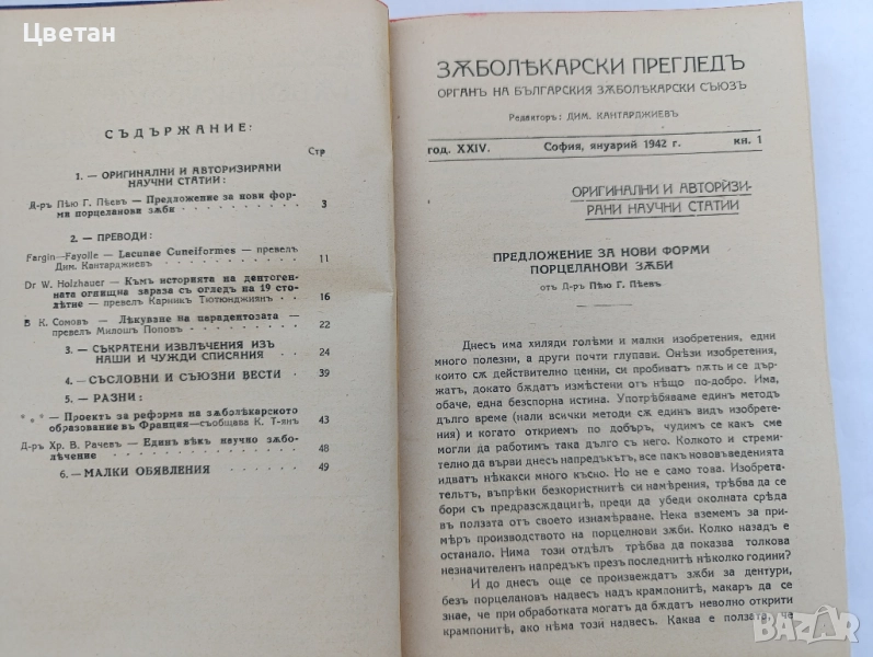 сп. Зъболекарски прегледъ, год. XXV, кн. 1-10, 1942 г. (в момента списанието го има само в МУЗЕЙ ПО ИСТОРИЯ НА МЕДИЦИНАТА), Автор(и): под ред. на Дим. Кантарджиев, Издателство: Органъ на Българския зъболекарски съюзъ