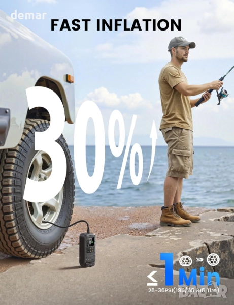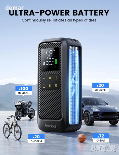 Тази преносима електрическа въздушна помпа осигурява бързо напомпване до 150 PSI с нисък шум, напомпвайки автомобилна гума за по-малко от минута. Компактна и лека, тя се побира лесно в жабка, чанта или поставка за чаши и се предлага с аксесоари за автомобили, велосипеди, мотоциклети и топки. Разполага с пет режима на напомпване, четири единици за налягане, функция за памет на налягането в гумите и топлоустойчив маркуч с 360° завъртане за удобство. Големият HD цифров дисплей осигурява точни показания с автоматично изключване при предварително зададено налягане. Тя служи и като външна батерия с USB-C зареждане и включва три LED режима на осветление за употреба в тъмни или аварийни ситуации.