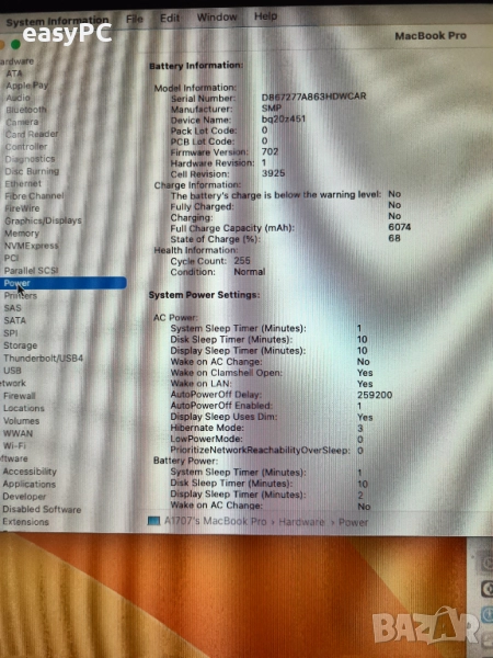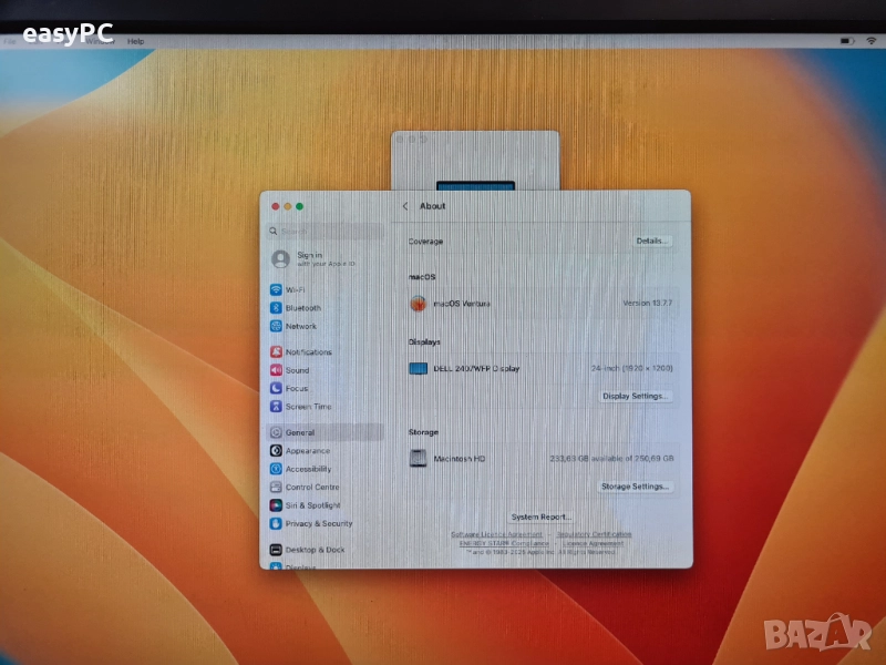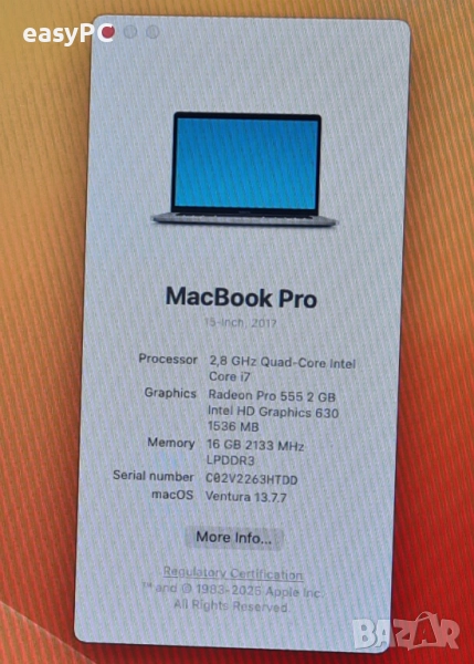 Работи перфектно на външен монитор и телевизор поддържа няколко дисплея. Инсталиран е с macOS VENTURA 13.7.7. С нормални следи от употреба, има леко ожулени ъгли - вижда се на снимките. Батерията е на 255 цикъла и е много добро състояние.