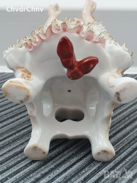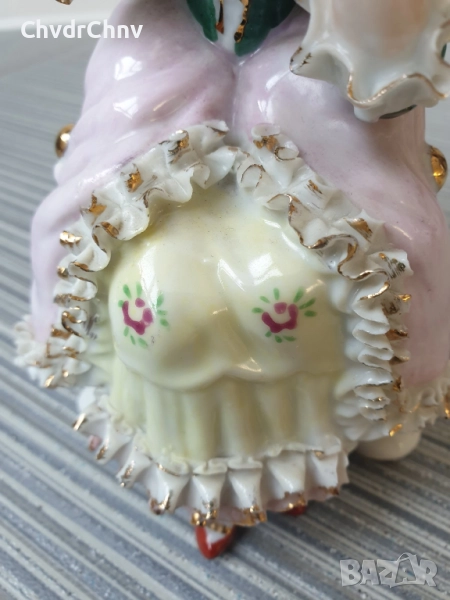 Височина 15 см, основа 9х10 см, плътен/тежък порцелан, детайлна, изцяло ръчно оцветяване, декорация с 22К злато, перфектно състояние (здрави пръстчета и дантели!).