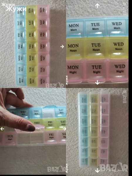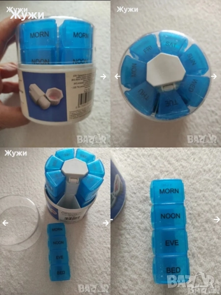 Голяма НОВА кутия за пуканки, има дадени размери.цена 3,20 лв. СЛЕДВАЩАТА кутия също е нова има дадени размери Цена 2,50 лв. СЛЕДВАТ нови чаши с капачета за кафе ,чай, много леки и удобни при пътуване ,цена за брой 2,90 лв. СЛЕДВА термос кана ,без забележки ,вместимост два литра, цена 7,90 лв. СЛЕДВА нова кутия за лекарства цена 3 лв. СЛЕДВАЩАТА кутия за лекарства ,цена 4,50 лв, като включва 7 отделения, по три по-малки отделения ,има за рязане на хапчета и за,стриване на прах. СЛЕДВА но датчик причупени на стъкла на втората снимка има упътване цена 8,90 лв. СЛЕДВА часовник за дома , цена 5 лв.