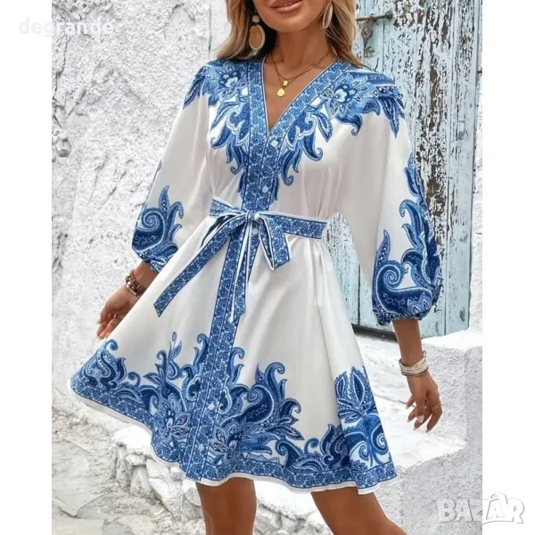 Рокля с орнаменти в стил Zimmermann Размер М/L за гръдна до 100-106 см, талия до 100 см, дължина 94 см стилна рокля със седем-осми ръкави, рязана в талията, с колан материята е с модерна и ефектна щампа роклята е свободна в талията и се регулира с колана състав: полиестер с еластан