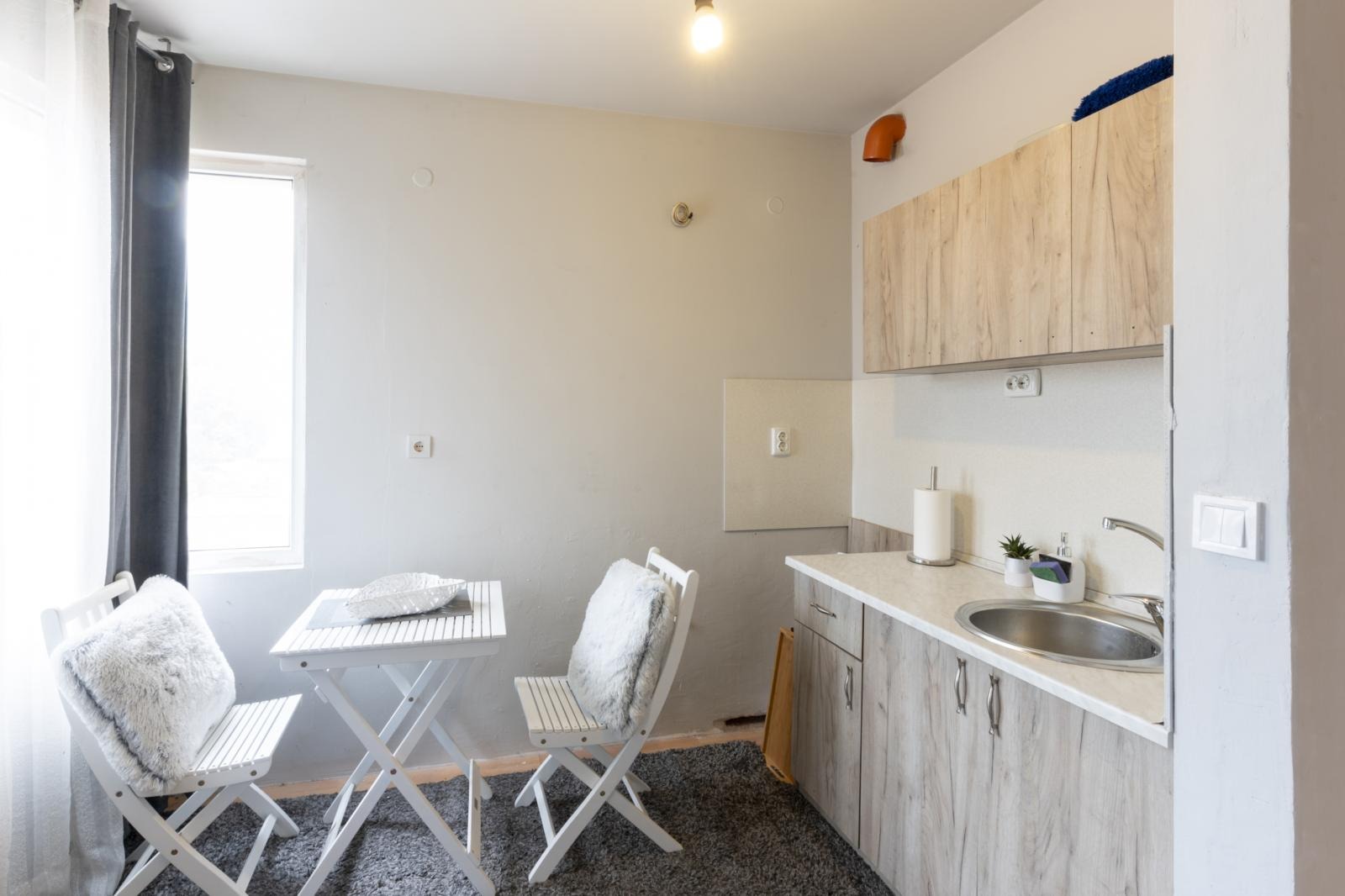 Състои се от трапезария с кухненски бокс и хубава тераса, преход към спалня, санитарен възел. Подходящ е за лично ползване или за даване под наем.
