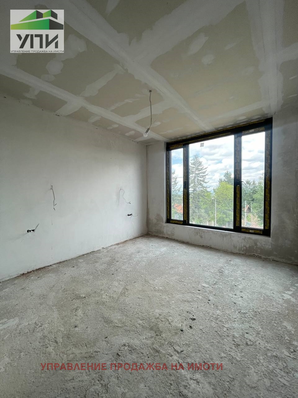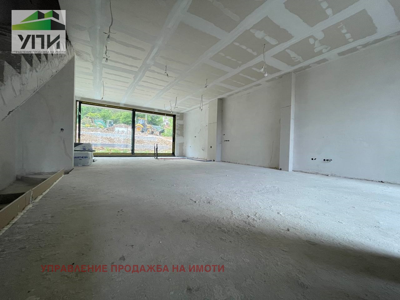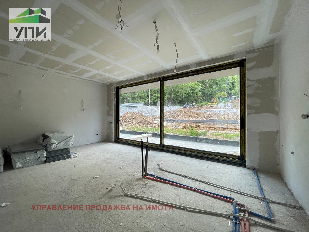 Първото ниво включва самостоятелен гараж с топла връзка към вътрешността, складово помещение и килер практично решение за съхранение и удобство в ежедневието. На партерния етаж е разположена просторна дневна зона с площ от около 95 кв.м., обединяваща хол, трапезария и кухненски бокс. Почти 4-метровата височина на таваните и големите прозорци създават усещане за откритост и свобода. От дневната има директен излаз към тераса и собствен озеленен двор, разкриващ красива гледка към гората. На това ниво се намира и баня с тоалетна.