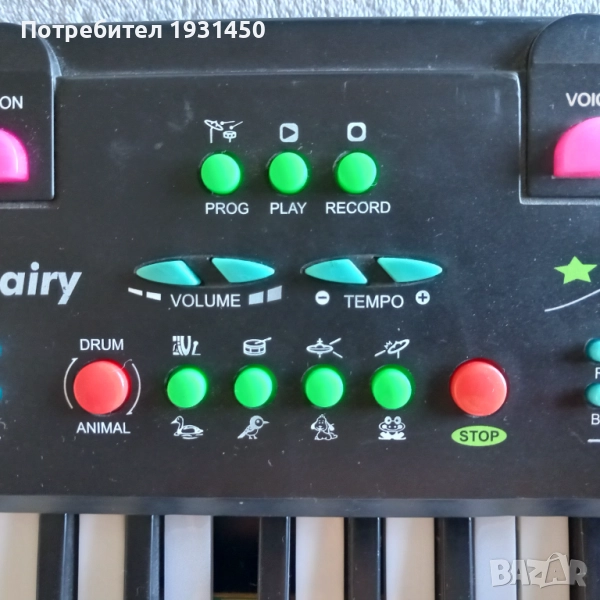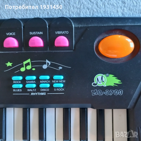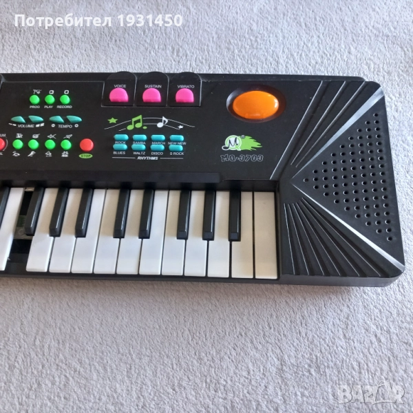 много хубава детска йоника всичко работи чудесно има говорител усилване на звука светещи лампички в ритъма на музиката вход за микрофон множество програмирани ритми и много други функции захранване с 4бр батерии АА или външен токоизправител 6 волта дължина 55см широчина 16,5см няма и един клавиш