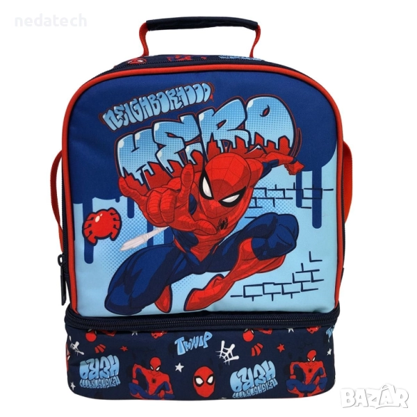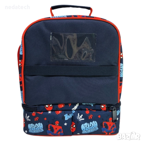 Термо чанта за обяд с дизайн на Спайдърмен. Разполага с 2 отделения за храната, плодовете или леката закуска на детето и за кърпата или сока. Има дръжка и дълга презрамка, етикет за данните на детето и син ластик на гърба.