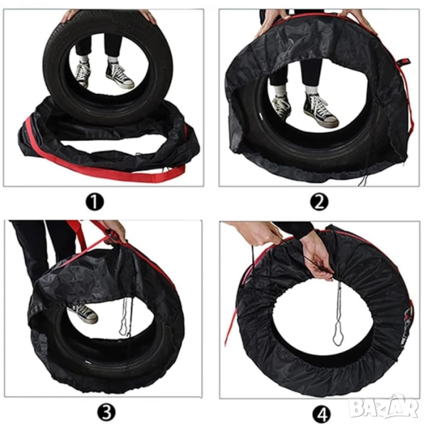 Калъфите са изработени от полиестер, снабдени са с ремъци за затягане и пренасяне, въжета които се затягат за претягане на калъфа към гумата.