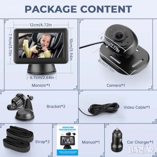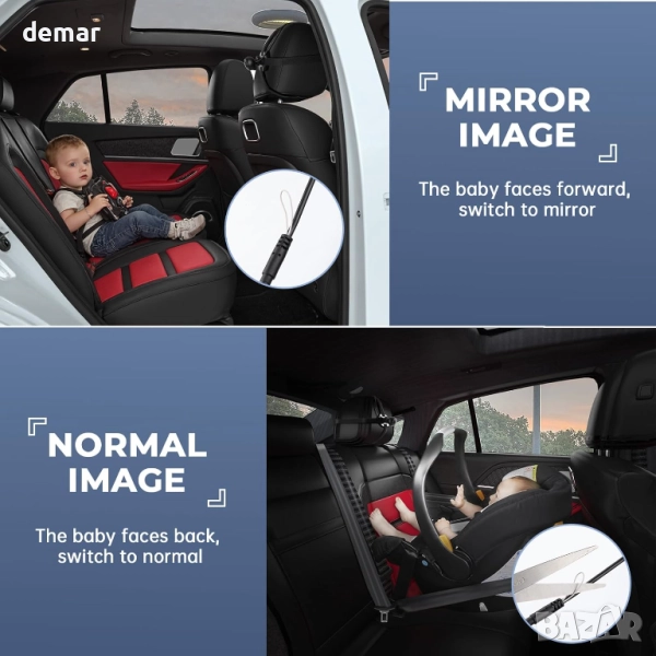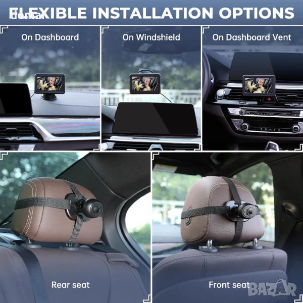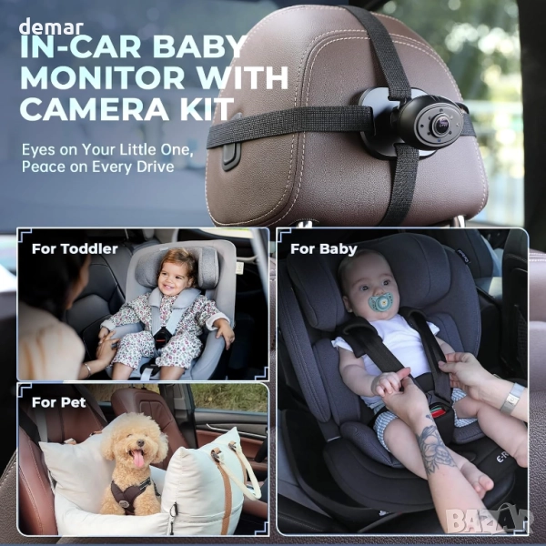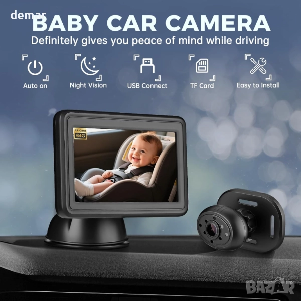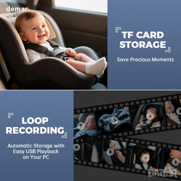 Тази бебешка автомобилна камера предлага стабилен, без вибрации изглед на вашето дете по време на шофиране, с вградена 64GB карта памет, която автоматично запазва записи за лесно гледане на компютър. Както мониторът, така и камерата имат широкоъгълна регулируемост, което позволява гъвкаво позициониране за най-добър изглед. Нощното виждане осигурява ясни изображения както при ярка, така и при слаба светлина, така че можете да виждате бебето си по всяко време без допълнително осветление. Проектирана за бърз и лесен монтаж само за минути, тя се закрепва здраво към облегалката за глава и се свързва чрез plug-and-play към дисплея на таблото, което прави пътуванията по-безопасни и по-спокойни.