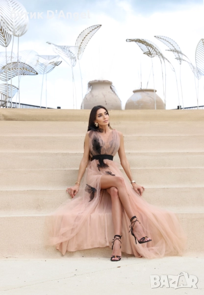 Дизайнерска рокля в екрю с цветя в черно от тюл и органза – елегантна и ефирна, с подчертано романтичен и модерен характер. Роклята е в мек nude нюанс, който подчертава нежността и женствеността. Изработена е от лека, тюлена материя, която създава обем и плавно движение. Горната част е с драпирана тюлена структура. Широк черен колан, който придава контраст и подчертава силуета. По роклята са разпръснати черни цветя от орагзна, които добавят артистичен и модерен акцент. Роклята е с висока цепка отпред, която разкрива крака и придава чувственост и изтънченост. Комбинирайте със златни аксесоари и черни сандали с връзки около глезена, за да завършите визията с изискан стил. Една различна, луксозна вечерна визия – идеална за официални събития, гала вечери или модни събития.