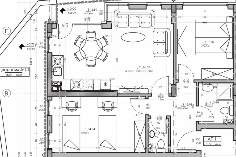 Тристаен партерен апартамент 89кв.м., със следното разпределение: предверие, хол с кухненски бокс, две спални, баня с тоалетна, тоалетна и двор 65кв.м.