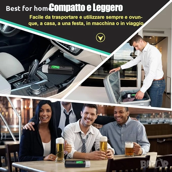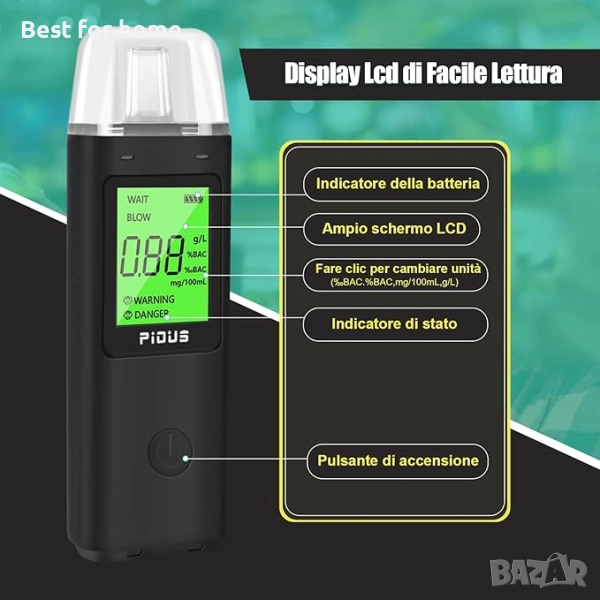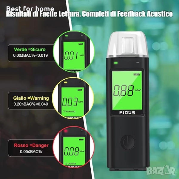 Преносим алкохолен тестер Pious, сертифициран презареждащ се алкохолен тест със звукова аларма за определяне на консумацията на алкохол, алкохолен тестер с 10 дюзи, подходящ за бар