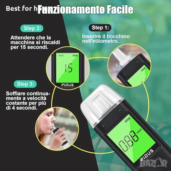 Безопасност и хигиена: сертифицираният преносим алкохолен тест се предлага с 10 сменяеми дюзи, изработени от безопасен за храни PP материал, миещи се и за многократна употреба.