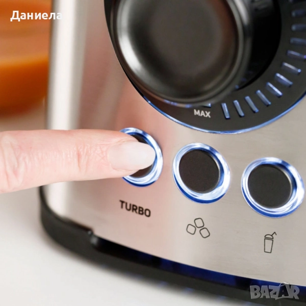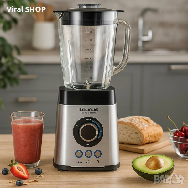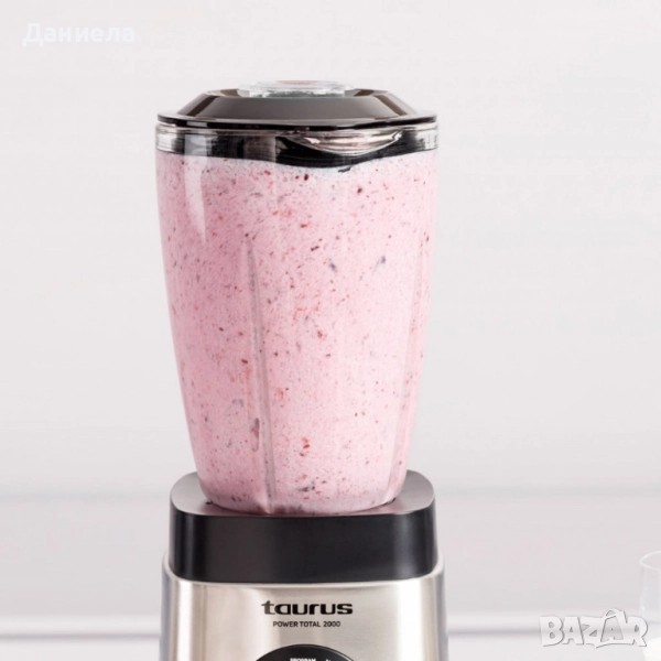 Продукт: Блендер Taurus PowerTotal 2000; Стъклена кана: 2,2 литра (1,8 л полезен обем); Основен проблем: Слаби блендери, които не могат да смилат лед, замразени плодове и твърди съставки; Решение: 2000W мотор, шестострие от неръждаема стомана и специализирани програми за лед и смутита; Функции: Регулируема скорост, турбо режим, програми за смути и лед, отвор за пълнене, мерителна чашка 50 мл; Допълнителни ползи: LED осветление на селектора, система за безопасност, неплъзгащи се крачета, кана за съдомиялна машина; Гаранция: 12 месеца.