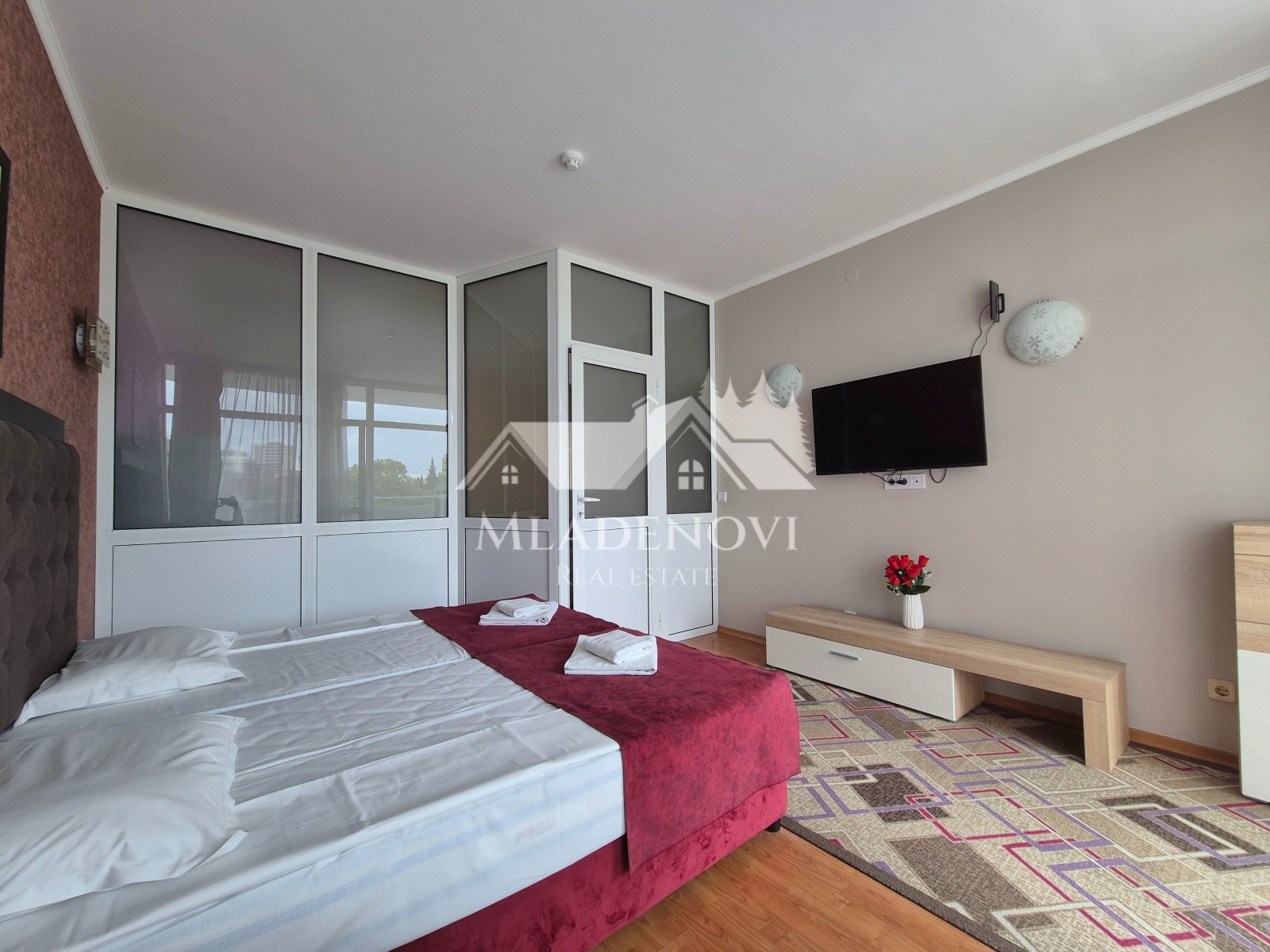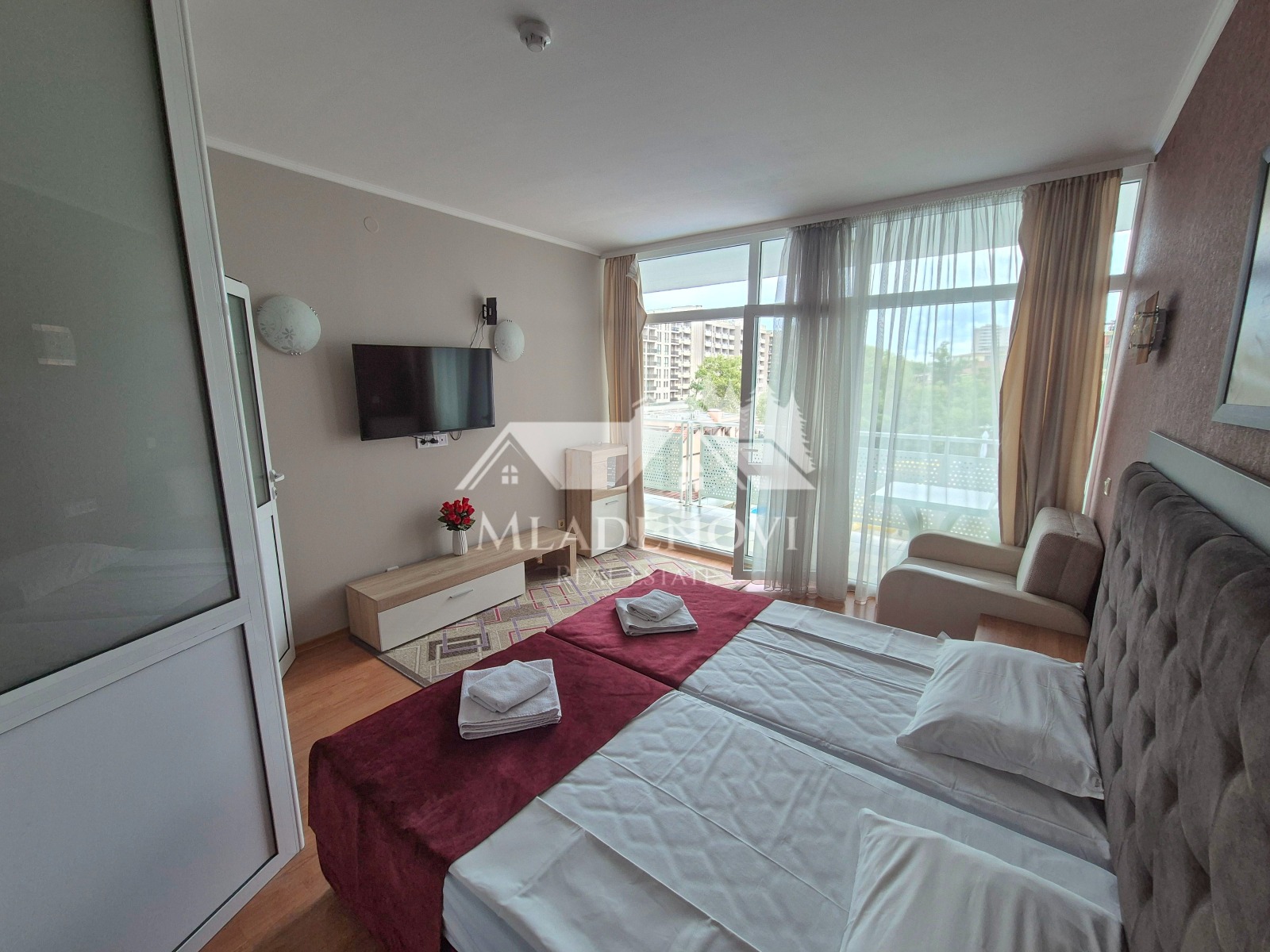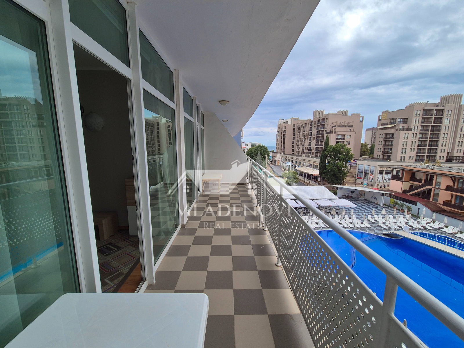 с гледка към морето в комплекс Grand Hotel NIRVANA . Комплексът е разположен в централната част на Слънчев Бряг, на около 200 м от плажната ивица. Апартаментът се намира на среден жилищен етаж от девет с асансьор, и е с квадратура 106 кв.м. Състои се от дневна с кухненски кът, коридор две самостоятелни спални, баня с вана и тоалетна, просторна тераса с гледка към морето и басейна. Апартаментът се продава с наличното оборудване и обзавеждане. Комплексът предлага комфорт, уют и удобство - басейн с детска секция, детска площадка, три ресторанта и воден бар, паркинг, денонощна охрана и поддръжка. Комплексът е с много добра локация, само на 200 м от плажа, в близост до аквапарк, автобусна спирка, разнообразни магазини и заведения за хранене и развлечения. Апартаментът е изключително подходящ за живеене и отдаване под наем целогодишно.
