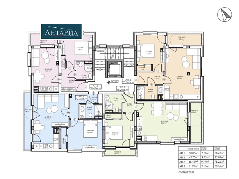 Апартаментът е на първи надпартерен етаж, състои се от дневна с кухненски бокс, спалня, баня с тоалетна и балкон.