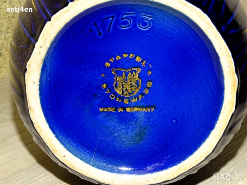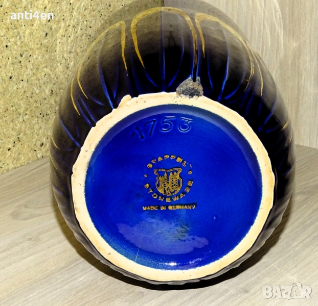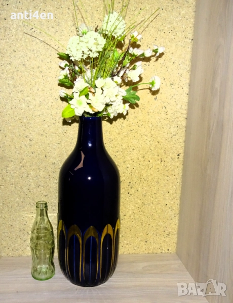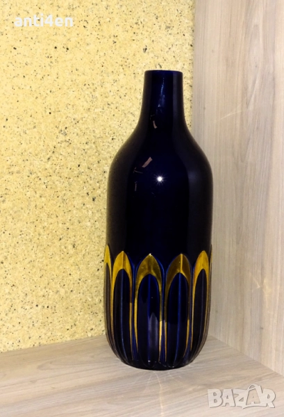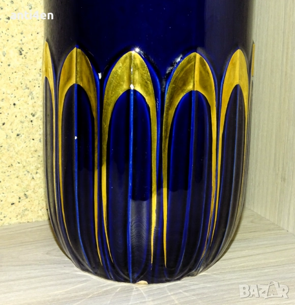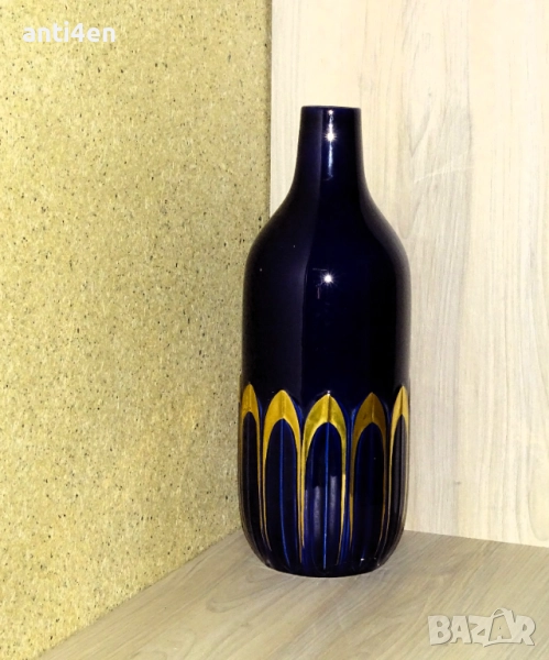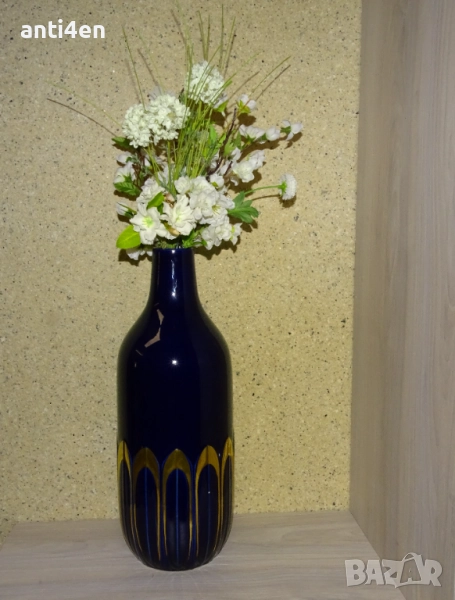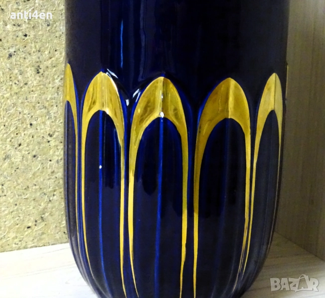 Вазата е в тъмносин цвят с декоративни орнаменти в златисто и височина 39 см.