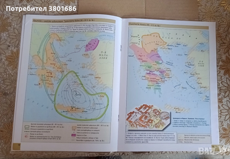 Атласа е закупен по изискване на учителя но е ползвало много малко и няма скъсано в него.Подарък към него е облеклото около него. Включените в него 26 панорамни учебни карти са четивни и съобразени с възможностите на петокласниците. Те представят всички исторически процеси, общества и държави от новата програма. Атласът съответства на новия образователен стандартУчебният материал е разгледан в 5 раздела:ПраисторияПървите цивилизацииДревна Елада и елинистическият святДревна ТракияДревен Рим Съдържание:ПраисторияНачало на човешката история. Старокаменна епоха (2 500 000 - 9000 г. пр. Хр.)Усвояване на земеделието. Откриване на металите (IX - III хил. Пр. хр.)Българските земи през новокаменната и каменно-медната епоха (VII -IV хил. пр. Хр.)Първите цивилизацииДревен Египет (IV - II хил. пр. Хр.)Първите държави в Месопотамия ( IV - II хил. пр. Хр.)Асирийската и Нововавилонската империя (XII - VII в. пр. Хр.)Персийската империя (VI - V в. пр. Хр.)Еврейски преселения и царства (II - I хил. пр. Хр.)Древна Елада и елинистическият святКритска и ахейска цивилизация. Троянската война (XX -XII е. пр. Хр.)Елинските полиси (VII - V е. пр. Хр.)Великата Гръцка колонизация (VII - VI в. пр. Хр.)Гръцко-персийските войни (500 - 449 г. пр. Хр.)Пелопонеската война (431 - 404 г. пр. Хр.)Империята на Александър Велики (336 - 323 г. пр. Хр.) и елинистически държавиДревна ТракияДревна Тракия и Одринското царство (V - IV е. пр. Хр.)Древен РимРанната Римска република. Пуническите войни (264 - 146 г. пр. Хр.)Късната Римска република. Гражданската война (46 - 46 г. пр. Хр.)Ранната Римска империя (I - III в.)Възникване и разпространение на християнството (I - II е.)Късната Римска империя и варварите (IV - V в.)Древна Тракия в Римската империя (I - II в.)