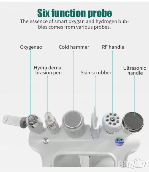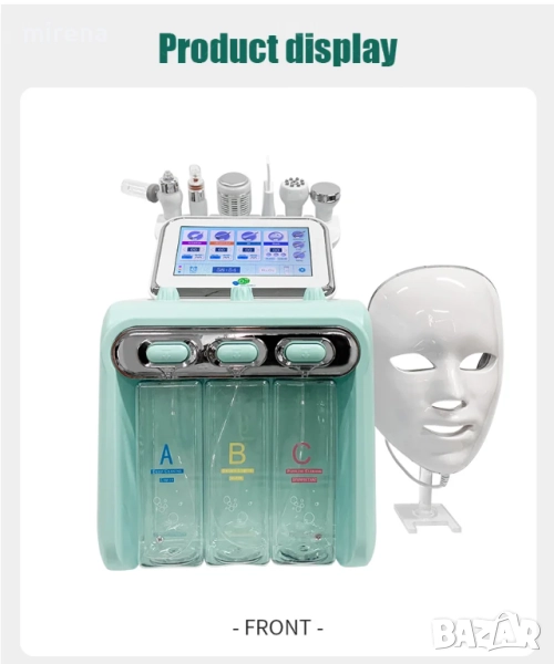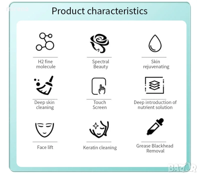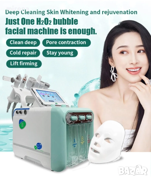 Това е най-новият апарат за лице, използващ генератор на водород и кислород, който превръща дестилираната вода във водородни и кислородни йони. Повърхността на кожата може да произведе H2 молекули, така че молекулите на водата бързо да проникнат в дермата. Кожата се подмладява, избелва и освежава.