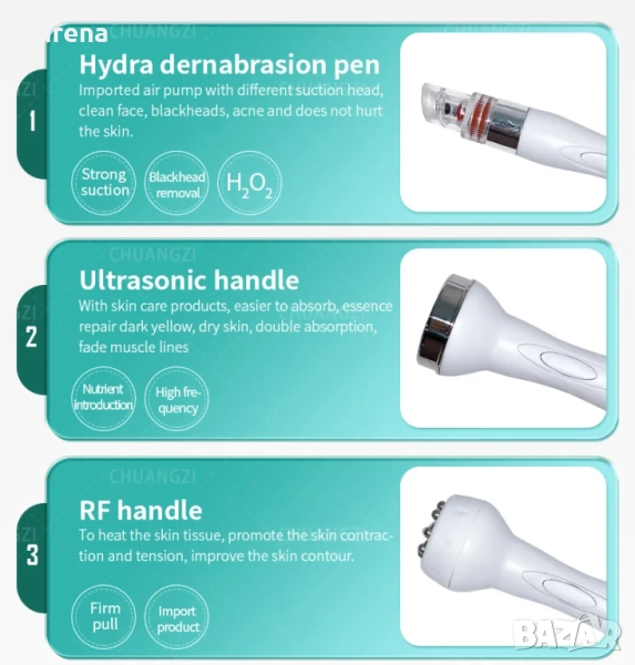 1) Накрайник с ултразвук: стимулира микроциркулацията, подмладява кожата.