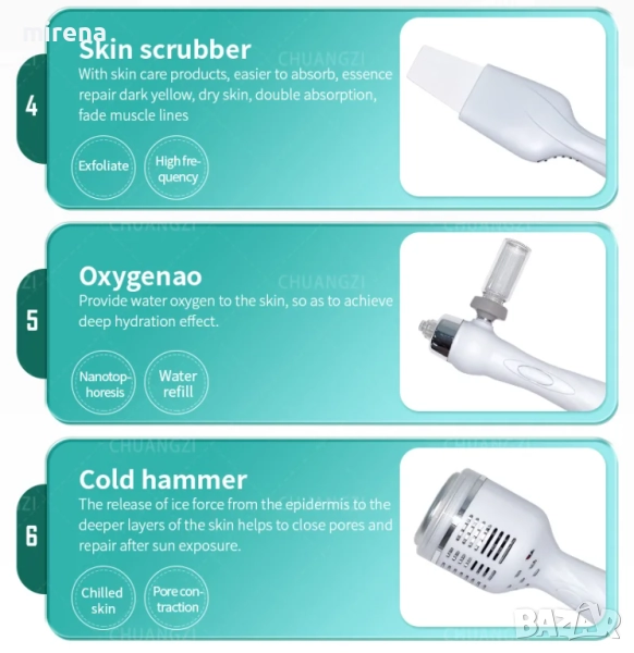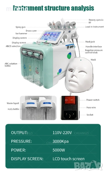 Козметичен уред за водно дермабразио, кислороден спрей, BIO RF, студен чук, ултразвук, фотон терапия и ултртазвукова шпатула
