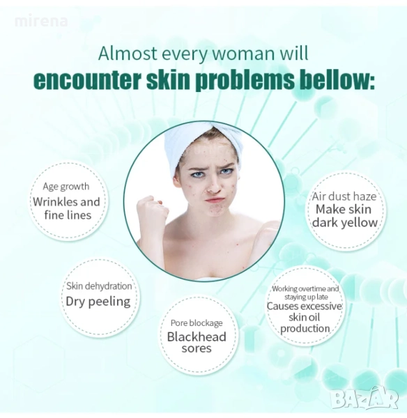 Свива порите, успокоява кожата, стяга кожата, премахва бръчките, стимулира производството на колаген, елиминира зачервяването и чувствителността, както и тъмните кръгове и торбичките под очите.