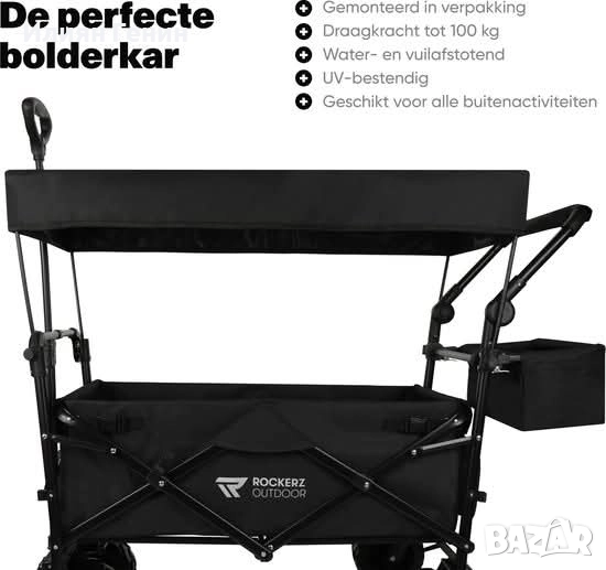 Представете си ден, изпълнен с безгранични приключения както за родители, така и за деца! Ръчната количка Rockerz за открито предлага редица предимства, които правят вашите приключения още по-комфортни. С предпазни колани и подплатена постелка за седалката, това е идеалният начин да транспортирате децата си безопасно. Можете лесно да съхранявате всичките си вещи в просторния вътрешен контейнер. Ръчната количка има лесен за закрепване покрив, който осигурява идеална защита от дъжд и слънце. Тази ръчна количка е подходяща за всякакви дейности на открито и затова е перфектният спътник за цялото семейство. Ръчната количка пристига напълно сглобена в опаковката. Така че, разгънете я и тръгвайте!