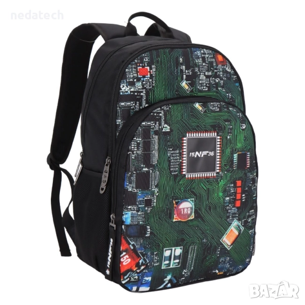 Черна ученическа раница с дизайн на вътрешността на компютър. Разполага с много отделения със здрави ципове и метални закопчалки и голямо подсилено отделение за лаптоп, интегрирано в основното отделение. Има джоб за организация и светлоотразителни ленти на гърба. С анатомичен гръб и ергономични презрамки.