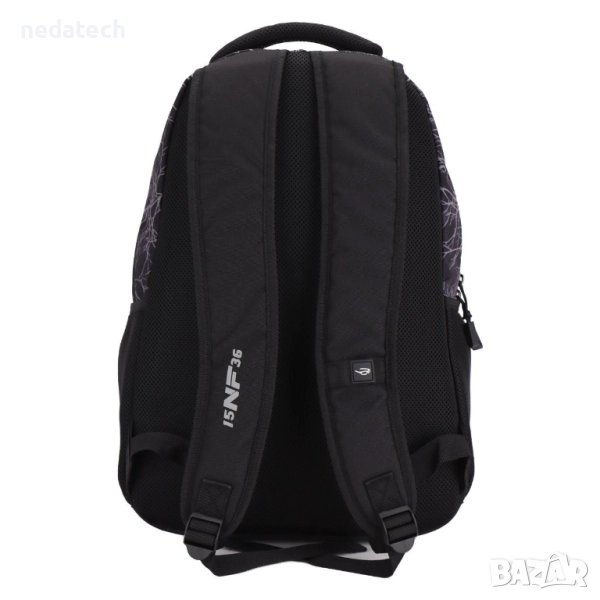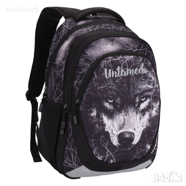Ученическа раница, черна с дизайн на вълк и надпис "Untamed". Разполага с 2 големи отделения, 1 преден джоб и 2 странични джоба с мрежа. Има мек гръб, дръжка и презрамки.