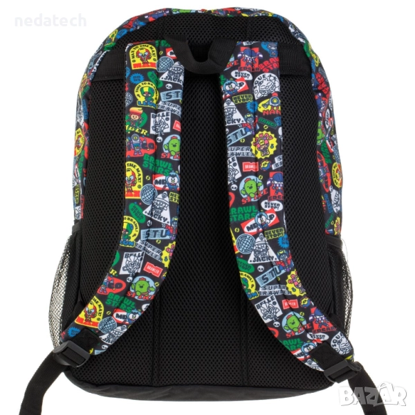 Ученическа раница в черно с цветни дизайни на Brawl Stars. Разполага с 2 отделения, 1 голям преден джоб и 2 странични джоба с черна мрежа. Има отделение за лаптоп, здрави черни ципове, мек гръб и дръжка.