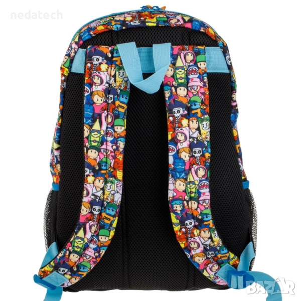 Ученическа раница в черно с цветни дизайни на Stumble Guys. Разполага с 2 отделения, 1 голям преден джоб и 2 странични джоба с черна мрежа. Има отделение за лаптоп, издръжливи тюркоазени ципове, мек гръб и дръжка.