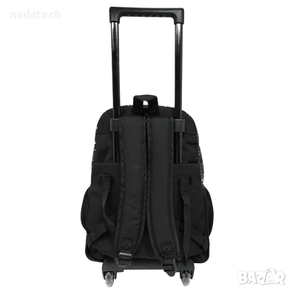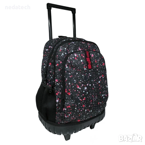 Ученическа раница на колелца, в черно с цветен дизайн с пъстри пръски и брокатени детайли. Разполага с 1 голямо отделение, 1 по-малко отделение и 1 голям преден джоб с органайзер. Има големи черни ципове и 2 странични джоба с мрежа. С P-образна дръжка до 80 см, колелца с прозрачно пластмасово покритие за по-голяма издръжливост, опорна основа и меки презрамки.