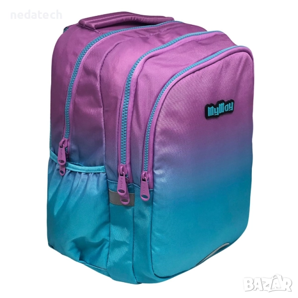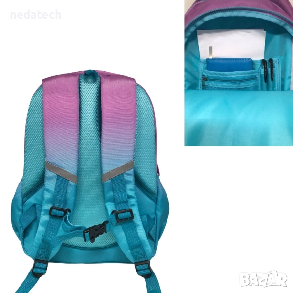 Ученическа раница с градиентно тюркоазено-лилаво покритие. Разполага с 3 отделения със здрави ципове. Има джоб за организация и 2 неопренови странични джоба и светлоотразителни ленти от всички страни. С анатомичен гръб, ергономични презрамки и 2 дръжки за окачване.
