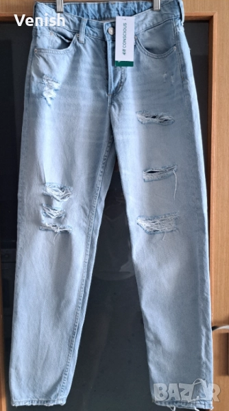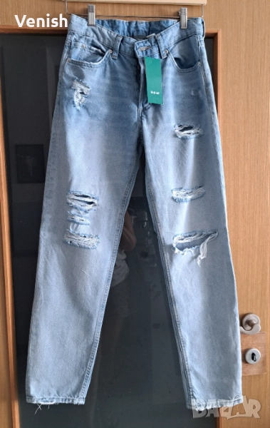 Нови дънки с етикети, един размер са и двата чифта. Имат лека разлика в цвета, единият чифт е леко по-светъл. Модел тип boyfriend, като размер са 34, което отговаря на 26-28 размер. Цената е за брой. За момиче или жена около 160-165 см.