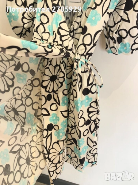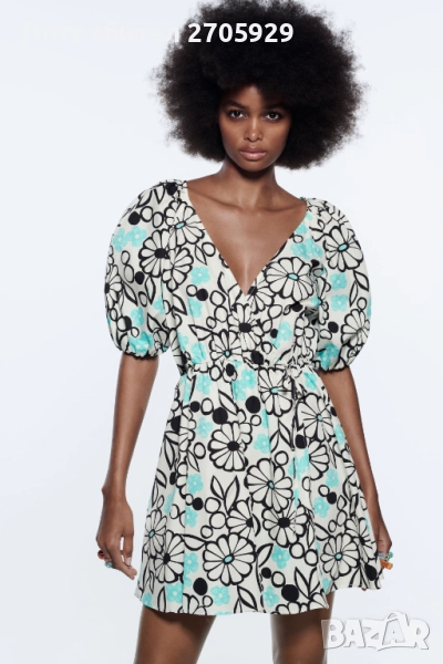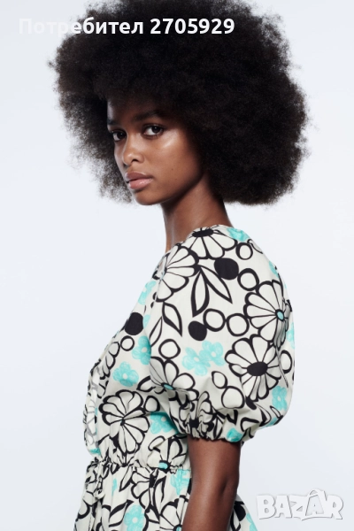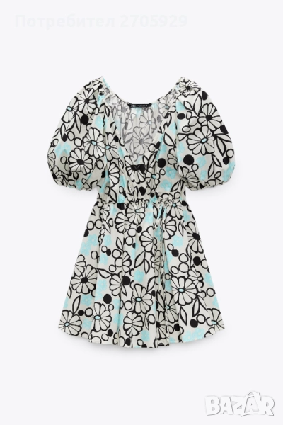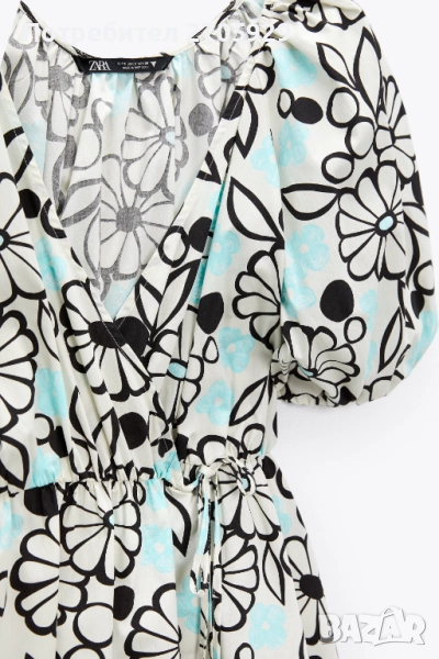 Флорална памучна рокля Zara с деколте с прихлупване. Къс буфан ръкав с ластичен маншет. Закопчаване с прихлупване с вътрешно копче и връзка отстрани. Размер М, става и за S/М.