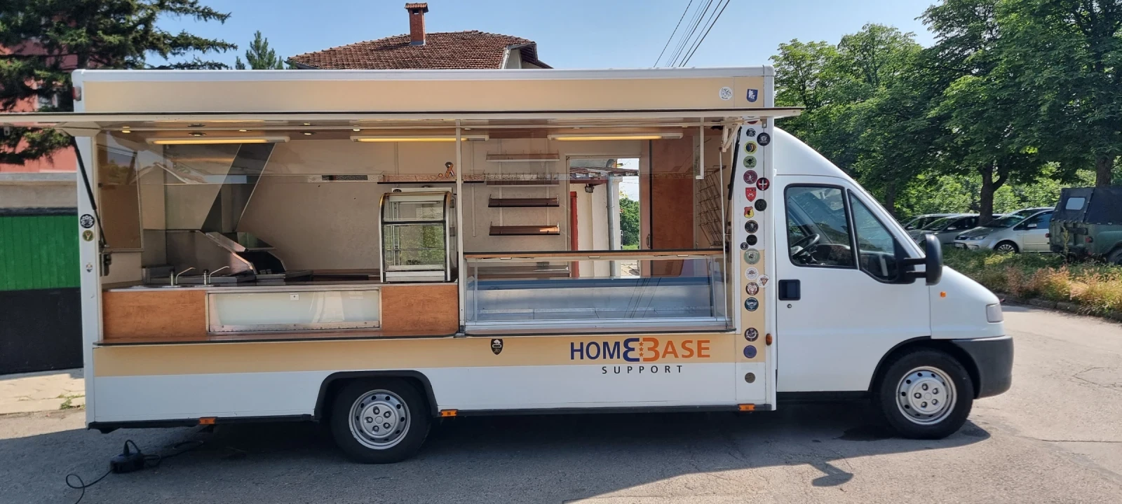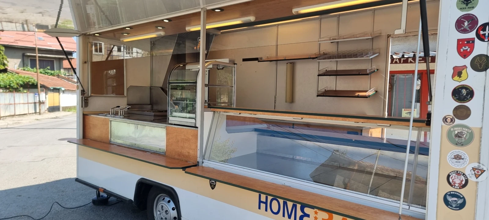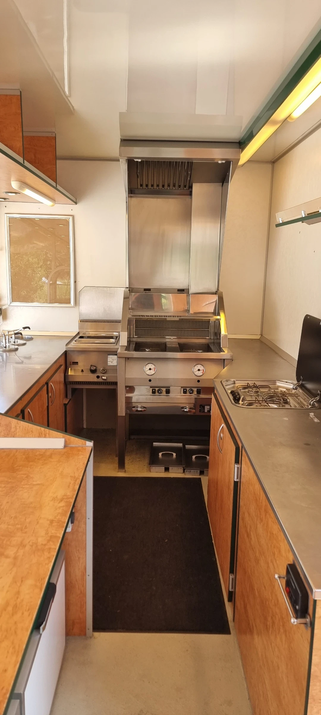 Оригинален мобилен кемпер, работна площ Д4. 50м, Ш2. 20м, В2. 20м, двоен газов фритюрник+аспирация, газово бен мари, газов котлон, електрическо бен мари, хладилна витрина 2м+3бр. хладилни склада, двойна мивка+бойлер+резервоари за мръсна и чиста вода, електрическо отваряне на страничния капак. МОБИЛНИ КУХНИ-ФРАНИ ви предлага до оборудване по ваш избор. .. .