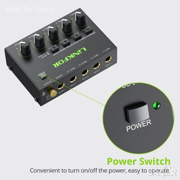 【Отделно управление и превключване между стерео/моно】 --- Всеки вход и изход има независим контрол на силата на звука. Регулирайте силата на звука според нуждите. Звуковият миксер поддържа превключване между стерео и моно с един бутон.