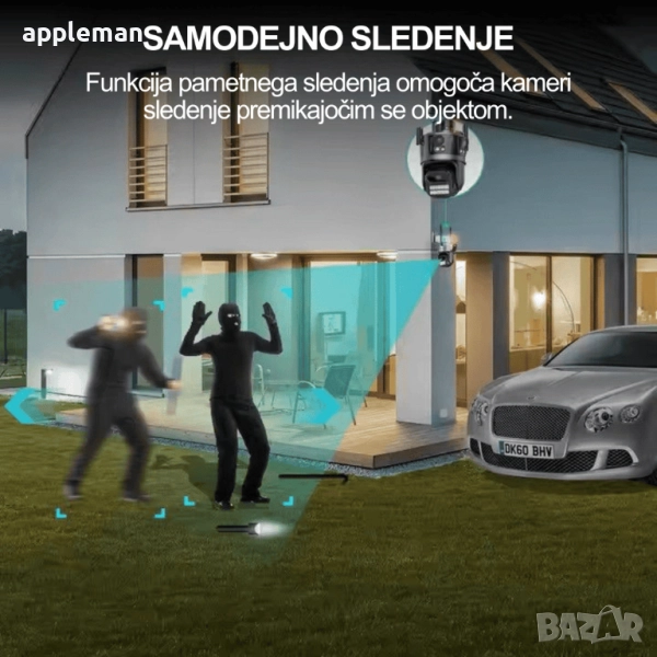 Автоматично проследяване с изкуствен интелект: Камерата автоматично засича и проследява движение на хора в защитената зона.